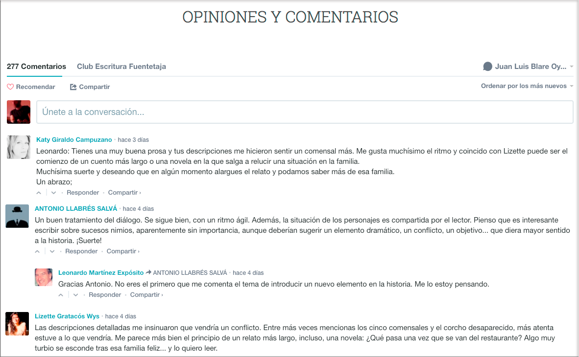 Los comentarios de los lectores (honrados, respetuosos, conformes a nuestro pacto ético) son unos de los valores más destacados de este club. La oportunidad de encontrarte con lectores interesados que además van a opinar con sinceridad sobre tu obra y ofrecerte la posibilidad de mejorarla a partir de las impresiones que desees asumir y recoger en tus reescrituras, hacen de esta plataforma de auto-publicación un espacio privilegiado para la creación. Aprovecharlo en todas sus posibilidades está ahora a tu alcance.