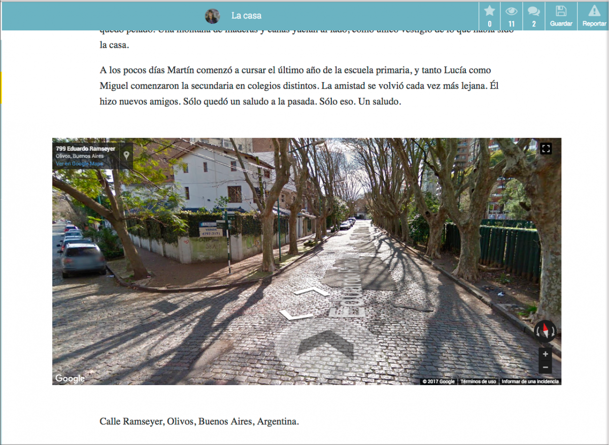 3) Insertar un mapa desde Google maps, lo que permite, frente a la imagen estática, que el lector pueda desplazar el mapa, aumentarlo o disminuirlo, hacer una nueva búsqueda, o también, con la aplicación Street view, colocarse virtualmente en la calle misma.