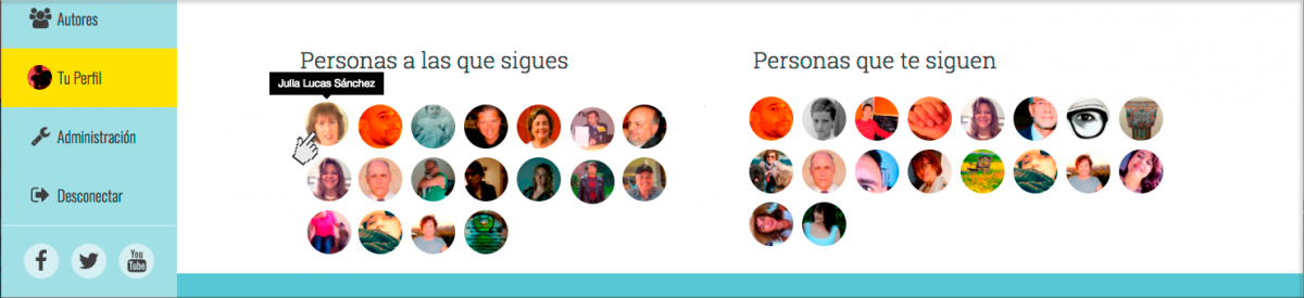 Puedes seguir a los autores cuyas obras más te hayan interesado haciendo clic en la fotografía de su avatar circular; en tu perfil podrás comprobar a quiénes estás siguiendo y quiénes te están siguiendo a tí, al punto de ir paulatinamente formando una comunidad viva y activa, con inquietudes similares, que disfruta de un diálogo en crecimiento.